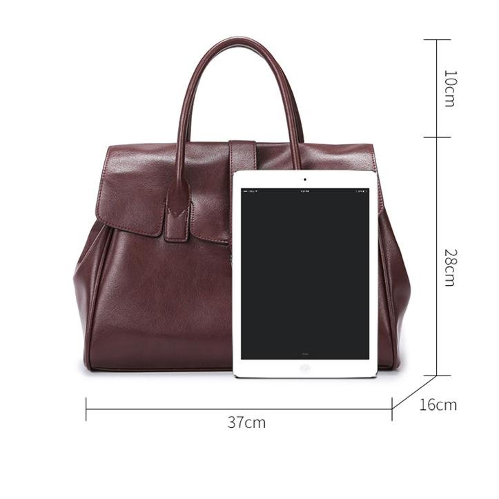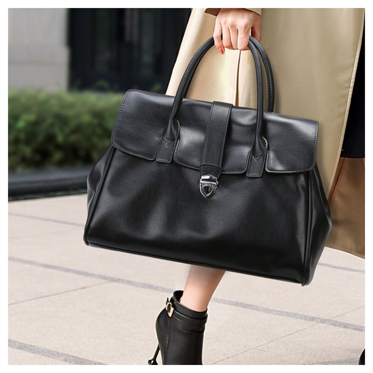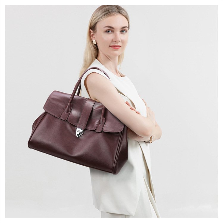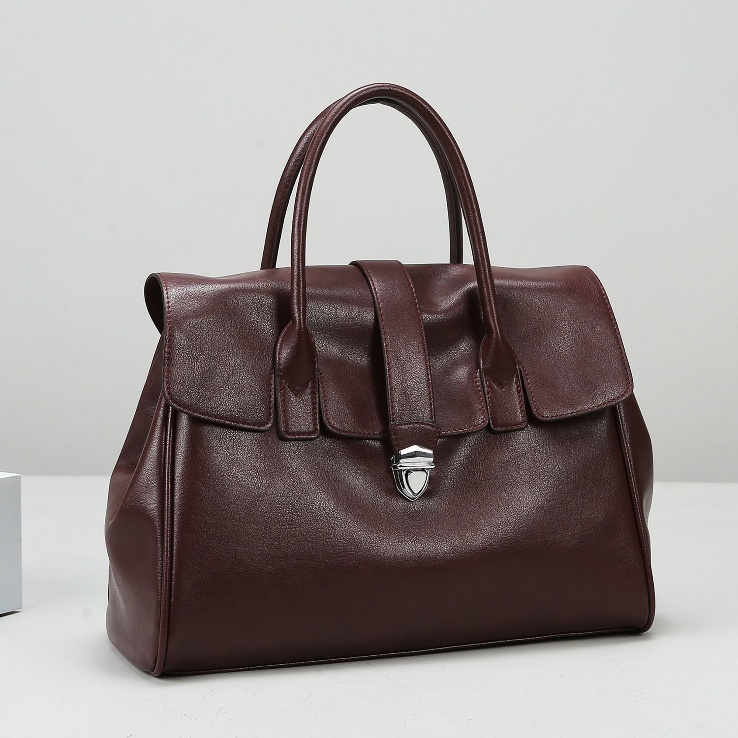 The fold-over flap and polished hardware closure add a vintage-inspired finish, while the roomy interior makes it perfect for workdays, travel, or elevated everyday styling. Dual top handles give it that chic, ladylike shape — structured, but never stiff.