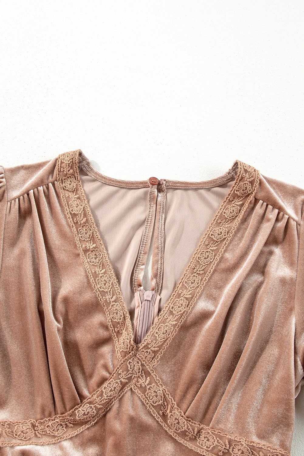 A delicate lacy V-neckline adds a romantic and feminine touch, drawing the eye to the collarbone.