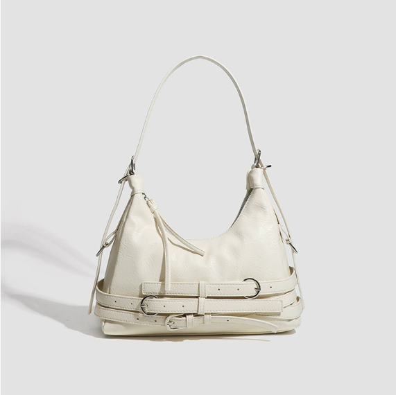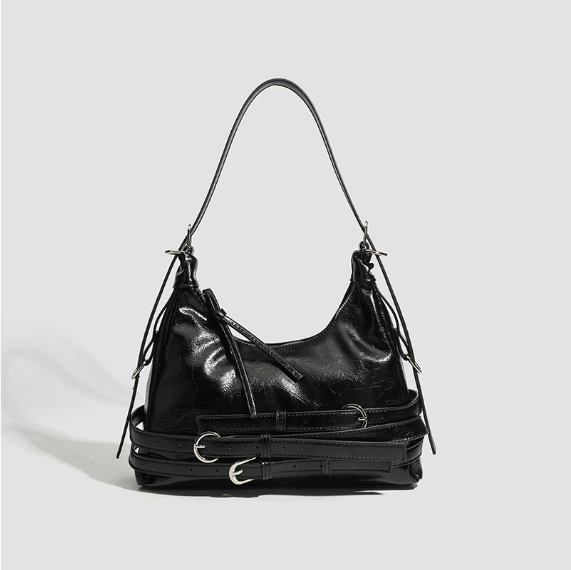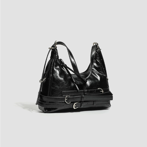 Buckle detailing and strap accents add a touch of hardware edge, while the roomy interior keeps your essentials close. Wear it over the shoulder for a sleek finish or style it cross-body for hands-free ease.